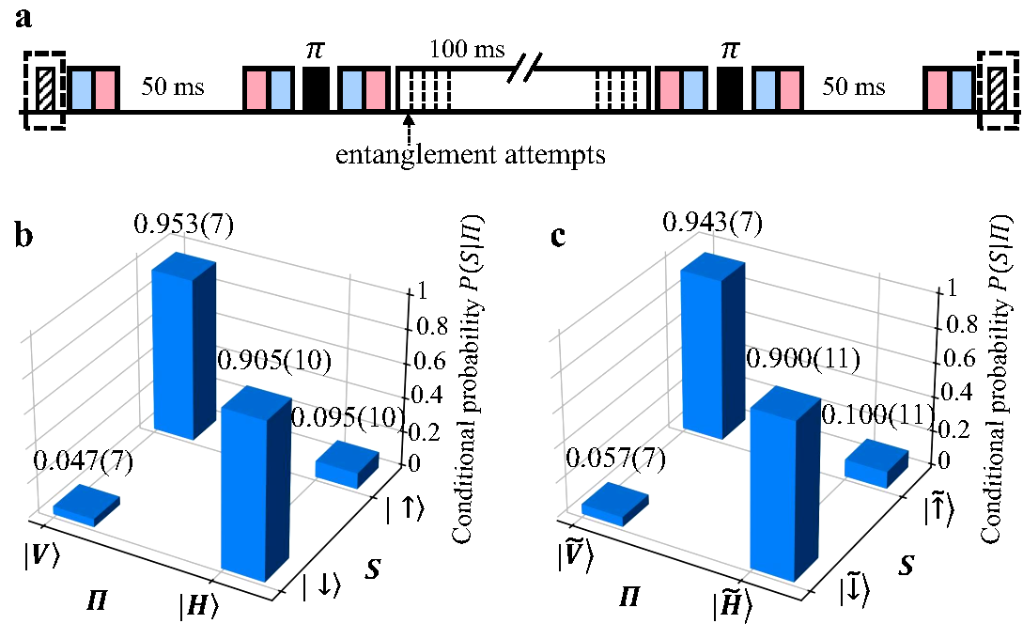 實驗發(fā)現(xiàn),通過此方法制備出的通訊比特,可在數(shù)百毫秒的時間內生成離子-光子糾纏;通過自旋回波方法可延長存儲比特的存儲壽命,實現(xiàn)相干時間達到秒量級的存儲量子比特。通過比較有無離子-光子糾纏生成操作時存儲比特的保真度變化,研究人員證實了兩種量子比特之間低于實驗精度的串擾誤差,從而實現(xiàn)了無串擾的量子網(wǎng)絡節(jié)點。