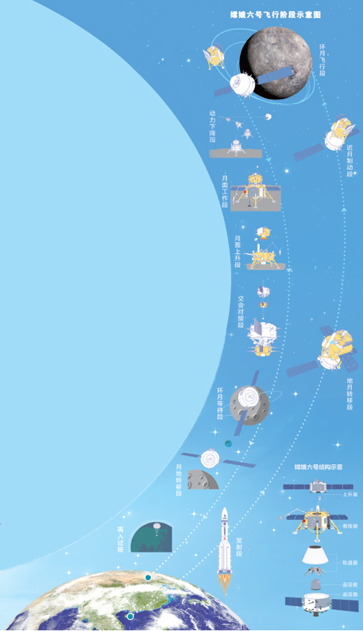 嫦娥五號探測器擁有“往返票”:在完成樣品采集后,還需將月球樣品帶回地球。23天時(shí)間、11個(gè)重大階段和重要步驟,科研人員迎難而上,創(chuàng)造了在地外天體的采樣與封裝等5項(xiàng)“中國首次”。