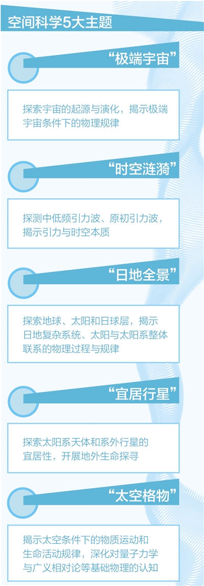制圖:張丹峰 10月15日,國務院新聞辦舉行新聞發(fā)布會,中國科學院、國家航天局、中國載人航天工程辦公室聯合發(fā)布《國家空間科學中長期發(fā)展規(guī)劃(2024—2050年)》(以下簡稱《規(guī)劃》)。 中國科學院院士、中國科學院副院長丁赤飚介紹,這是我國空間科學領域首個國家層面統(tǒng)一的中長期發(fā)展規(guī)劃,歷時2年多,來自科研院所、高校和行業(yè)部門等相關領域的500多名專家學者參與了編制。 提出5大科學主題和17個優(yōu)先發(fā)展方向 《規(guī)劃》明確了我國空間科學發(fā)展的總目標:梯次布局和論證實施國家空間科學任務,統(tǒng)籌和強化任務驅動的基礎研究,打造空間科學高水平人才隊伍,不斷取得具有重大國際影響力的標志性原創(chuàng)成果,實現空間科學高質量發(fā)展,躋身國際前列,成為空間科學強國。 《規(guī)劃》提出了我國有望取得突破的5大科學主題和17個優(yōu)先發(fā)展方向。 “極端宇宙”主題。主要是探索宇宙的起源與演化,揭示極端宇宙條件下的物理規(guī)律。優(yōu)先發(fā)展方向包括暗物質與極端宇宙、宇宙起源與演化、宇宙重子物質探測。 “時空漣漪”主題。主要是探測中低頻引力波、原初引力波,揭示引力與時空本質。優(yōu)先發(fā)展方向是空間引力波探測。 “日地全景”主題。主要是探索地球、太陽和日球層,揭示日地復雜系統(tǒng)、太陽與太陽系整體聯系的物理過程與規(guī)律。優(yōu)先發(fā)展方向包括地球循環(huán)系統(tǒng)、地月綜合觀測、空間天氣探測、太陽立體探測、外日球層探測。 “宜居行星”主題。主要是探索太陽系天體和系外行星的宜居性,開展地外生命探尋。優(yōu)先發(fā)展方向包括可持續(xù)發(fā)展、太陽系考古、行星圈層刻畫、地外生命探尋、系外行星探測。 “太空格物”主題。主要是揭示太空條件下的物質運動和生命活動規(guī)律,深化對量子力學與廣義相對論等基礎物理的認知。優(yōu)先發(fā)展方向包括微重力科學、量子力學與廣義相對論、空間生命科學等。 此外,《規(guī)劃》提出了至2050年我國空間科學發(fā)展路線圖。第一階段,至2027年,運營中國空間站,實施載人月球探測、探月工程四期與行星探測工程,論證立項5—8項空間科學衛(wèi)星任務,形成若干有重要國際影響力的原創(chuàng)成果。第二階段,2028年至2035年,繼續(xù)運營中國空間站,論證實施載人月球探測、國際月球科研站等科學任務,論證實施約15項空間科學衛(wèi)星任務,取得位居世界前列的原創(chuàng)成果。第三階段,2036年至2050年,論證實施30余項空間科學任務,重要領域達到世界領先水平。 首次載人登月將開展較大規(guī)??臻g科學實驗 中國載人航天工程新聞發(fā)言人、中國載人航天工程辦公室副主任林西強介紹,未來10年,中國空間站將面向世界科技前沿、面向國家重大需求,聚焦空間生命與人體研究、微重力物理科學、空間天文與地球科學以及空間新技術4大研究領域,安排32個研究主題,準備滾動實施上千項科學研究與應用項目。 圍繞空間天文重大前沿問題,我國將發(fā)射具有國際先進水平的2米口徑巡天空間望遠鏡,目前已在北京、長三角地區(qū)、粵港澳大灣區(qū)建設了相應的科學中心,部署7個研究方向、24個研究項目,有望在宇宙學、星系科學、銀河系、太陽系天體、暫現源等方面取得重要科學突破。 下一步,我國還要實施載人月球探測工程。載人月球探測是促進人類文明進步、彰顯大國擔當的戰(zhàn)略實踐。中國人首次登陸月球,發(fā)揮好航天員在月面開展探測活動的獨特優(yōu)勢,將為我國探索地外天體提供更為廣闊的歷史機遇。林西強表示,將統(tǒng)籌利用首次載人登月前的飛行試驗以及載人登月任務機會,開展較大規(guī)模的空間科學實驗,目前已初步規(guī)劃月球科學、月基科學和資源勘查利用3個領域9大方向的科學目標。 促進空間科學的研究成果向實際應用轉化 中國科學院院士、中國科學院國家空間科學中心主任王赤介紹,當前,我國空間科學的原創(chuàng)成果開始呈現出多點突破態(tài)勢?!拔蚩铡碧栭_展暗物質粒子探測、“墨子”號首次開展空間尺度的量子科學實驗,“慧眼”是我國首個空間X射線天文望遠鏡,“羲和”“夸父”競相逐日,嫦娥六號首次實現月球背面采樣返回,“天問一號”開啟我國火星探測的序幕,中國空間站建成我國首個太空實驗室。 這些任務的實施,推動我國科學家在暗物質粒子探測、量子力學檢驗、高能天體物理實驗、太陽“一磁兩暴”觀測、高能時域天文觀測、月球形成與演化、火星環(huán)境與地質構造、空間環(huán)境下的物質運動規(guī)律和生命活動規(guī)律等方面,取得了重要的科學研究進展和成果,深化了人類對宇宙的認識,也標志著我國正在走近世界空間科學舞臺的中央。 未來如何進一步促進空間科學的研究成果向實際應用轉化?中國科學院院士、中國科學院重大科技任務局局長朱俊強表示,總體而言,成果的推廣應用依賴企業(yè)、政府、科研院所和高校通力合作。 第一,跨學科大聯合。對已取得的成果進行深度挖掘,獲得更多成果。第二,企業(yè)、科研院所和高校一起合作,真正推動這些成果的應用轉化,在不同領域、不同行業(yè),找到它們的落腳點。第三,政策支持以及引導社會資金