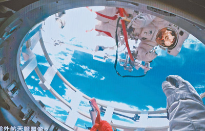 航天員蔡旭哲在空間站組合體艙外工作的畫面。