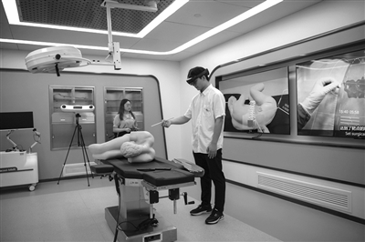 在位于安徽省蕪湖市的“中國視谷”,工作人員在模擬手術室里演示數(shù)字化手術輔助平臺。新華社發(fā)(肖本祥 攝)