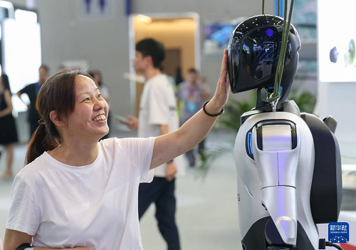 9月5日,觀眾在2025世界智能產(chǎn)業(yè)博覽會(huì)上觸摸人形機(jī)器人。新華社記者 陳誠 攝