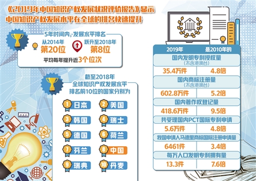 9月14日,中國國家知識產(chǎn)權局知識產(chǎn)權發(fā)展研究中心發(fā)布的《2019年中國知識產(chǎn)權發(fā)展狀況評價報告》顯示,中國知識產(chǎn)權發(fā)展水平在全球的排名快速提升,短短5年時間內(nèi),排名已從2014年的第20位,快速躍升至2018年的第8位,平均每年提升近3個位次。 《報告》還顯示,截至2018年,全球知識產(chǎn)權發(fā)展水平排名前10位的國家分別為日本、美國、韓國、瑞士、德國、荷蘭、芬蘭、中國、瑞典和丹麥。單看知識產(chǎn)權能力,我國2018年已躍居全球第5位,僅次于美國、日本、瑞士和芬蘭;知識產(chǎn)權績效更是排名全球第3位。這些都說明,我國知識產(chǎn)權大國的地位更穩(wěn)了。 近年來增速明顯加快 知識產(chǎn)權發(fā)展研究中心主任韓秀成介紹,全國知識產(chǎn)權發(fā)展狀況指數(shù)以2010年為基期年份,設置2010年綜合及創(chuàng)造、運用、保護、環(huán)境發(fā)展指數(shù)為100,并對2010年至2019年的全國數(shù)據(jù)進行測算。 記者注意到,這些指標每年都會調(diào)整和更新,以求更加精準。2019年該指標體系由創(chuàng)造、運用、保護和環(huán)境4個一級指標組成,共下設46個三級指標。其中,“專利密集型產(chǎn)業(yè)增加值占GDP的比重”是今年新增的指標。今年3月份,國家知識產(chǎn)權局、國家統(tǒng)計局聯(lián)合發(fā)布公告顯示,2018年我國專利密集型產(chǎn)業(yè)增加值為107090億元,占GDP比重為11.6%。 根據(jù)新指標計算,2010年以來,全國知識產(chǎn)權綜合發(fā)展指數(shù)呈持續(xù)增長態(tài)勢,2019年繼續(xù)穩(wěn)步上升,達到279.2。 記者還注意到,如果以2013年為分界點,近年來中國知識產(chǎn)權領域的進步更為明顯——2013年之前,我國知識產(chǎn)權綜合發(fā)展指數(shù)年均增長率為5.4%,2013年之后這一指數(shù)年均增長率達到15.0%。黨的十八大以后,我國創(chuàng)新指數(shù)增速也明顯加快,2019年達到270.5,年均增長率為11.7%。 快速增長的指數(shù)背后,是知識產(chǎn)權創(chuàng)造各指標相應領域取得了顯著成績。2019年,我國國內(nèi)發(fā)明專利授權量為35.4萬件(不含港澳臺),是2010年的4.8倍;國內(nèi)商標注冊量為602.8萬件(不含港澳臺),是2010年的5.2倍;國內(nèi)著作權登記量為418.6萬件,是2010年的9.5倍;共受理國內(nèi)PCT國際專利申請5.6萬件,是2010年的4.8倍;我國申請人馬德里商標國際注冊申請量為6461件,是2010年的3.4倍;每萬人口發(fā)明專利擁有量13.3件,是2010年的7.6倍。 2019年,我國國內(nèi)發(fā)明專利平均維持年限為6.6年,較2010年增加1年,體現(xiàn)出在專利繳納年費制度的經(jīng)濟杠桿作用下,我國專利質(zhì)量穩(wěn)步提升。 含金量越來越足 自2010年以來,我國知識產(chǎn)權運用指數(shù)整體呈平穩(wěn)增長態(tài)勢,年均增長率為9.9%。知識產(chǎn)權運用效益日益凸顯,有力促進了經(jīng)濟社會發(fā)展。2018年,我國版權產(chǎn)業(yè)的行業(yè)增加值占GDP比重達7.37%,較2010年提升0.8個百分點。 市場主體運用知識產(chǎn)權的能力逐步提高。2019年專利申請權和專利權轉(zhuǎn)讓數(shù)量為21.3萬件,是2010年的35.7倍。2019年商標轉(zhuǎn)讓數(shù)達到44.6萬件,是2010年的7.0倍。2018年我國技術市場合同成交項數(shù)為41.2萬項,金額達1.8萬億元,分別是2009年的1.9倍和5.8倍。 韓秀成表示,知識產(chǎn)權得到有效運用,離不開良好的知識產(chǎn)權保護環(huán)境。近年來,我國司法保護體系建設全面加強,審理案件數(shù)量成倍增長,審判質(zhì)效也大幅提升。2019年,我國法院新收知識產(chǎn)權民事、行政、刑事一審案件量分別是2010年的9.5倍、7.5倍、1.3倍;檢察機關批準逮捕涉及知識產(chǎn)權犯罪案件數(shù)為4346件,提起公訴的涉及知識產(chǎn)權犯罪案件為5433件,分別是2010年的2.8倍、3.2倍。此外,各有關部門、各地區(qū)聯(lián)合開展重點專項工作,也有效遏制了侵權、假冒、盜版等違法行為蔓延的勢頭。 同時,知識產(chǎn)權保護法律法規(guī)體系更加完善。2019年,我國完成了商標法修改;中辦、國辦印發(fā)實施《關于強化知識產(chǎn)權保護的意見》。我國知識產(chǎn)權保護成效獲得了社會公眾普遍認可,2019年我國知識產(chǎn)權保護社會滿意度為78.98分,較2012年提升15.29分。 仍有待提質(zhì)增效 我國知識產(chǎn)權蓬勃發(fā)展的同時,也存在明顯不足?!秷蟾妗凤@示,從創(chuàng)造數(shù)量、質(zhì)量和效率指數(shù)絕對值情況來看,全國絕大部分地區(qū)知識產(chǎn)權創(chuàng)造質(zhì)量指數(shù)較數(shù)量指數(shù)、效率指數(shù)偏低。“比如,反映專利質(zhì)量的專利維持年限以及反映知識產(chǎn)權海外布局的PCT國際專利申請受理量、馬德里商標國際注冊申請量等?!表n秀成表示,這說明我國知識產(chǎn)權含金量有待進一步提升。 此外,從運用規(guī)模、運用效益的指數(shù)絕對值來看,全國大部分地區(qū)知識產(chǎn)權運用規(guī)模指數(shù)高于運用效益指數(shù),也就是說,雖然越來越多的知識產(chǎn)權得到了運用,但效益并不突出,這與知識產(chǎn)權的質(zhì)量、運營環(huán)境都有一定關系。 與全球其他國家相比,更能看出我國知識產(chǎn)權短板所在。在國際比較中,2018年我國知識產(chǎn)權環(huán)境指數(shù)排第23位,落后于知識產(chǎn)權能力和績效的排名。在環(huán)