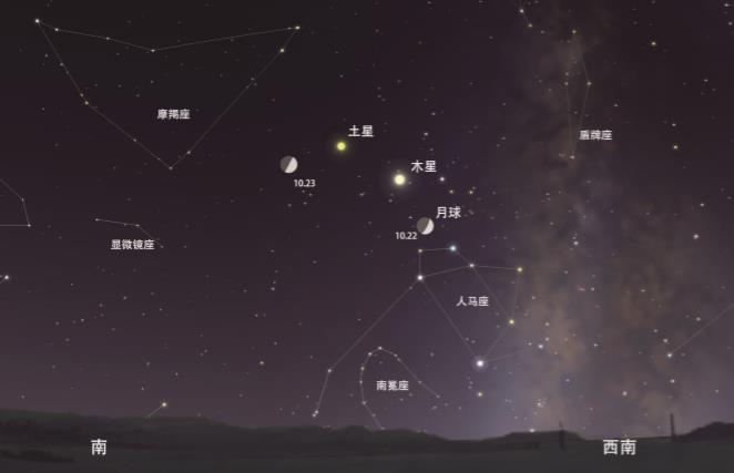 2020年10月22日~23日,日落后2個小時的西南方天空示意圖。(北京天文館供圖)