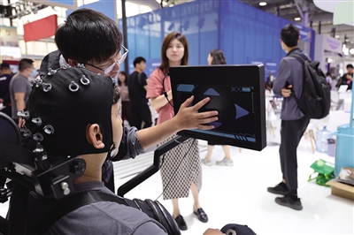 圖為2024服貿(mào)會(huì)上,工作人員在為參觀者講解使用非侵入式腦機(jī)接口技術(shù)的腦控神經(jīng)康復(fù)訓(xùn)練機(jī)器人。記者 戚曉毅 攝