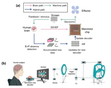 (a)腦-憶阻器交互式更新框架;(b)基于憶阻器腦電解碼的實(shí)時(shí)腦控?zé)o人機(jī)飛行。(聯(lián)合研究團(tuán)隊(duì)供圖)