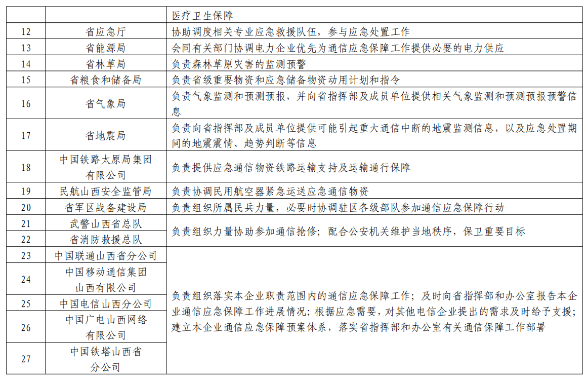 成員:省通信管理局、省委宣傳部、省委網(wǎng)信辦、省發(fā)展改革委、省公安廳、省財(cái)政廳、省自然資源廳、省交通廳、省水利廳、省衛(wèi)健委、省應(yīng)急廳、省能源局、省林草局、省糧食和儲備局、省氣象局、省地震局、中國鐵路太原局集團(tuán)有限公司、民航山西安全監(jiān)管局、省軍區(qū)戰(zhàn)備建設(shè)局、武警山西省總隊(duì)、省消防救援總隊(duì)以及省基礎(chǔ)電信企業(yè)等部門單位相關(guān)負(fù)責(zé)人。