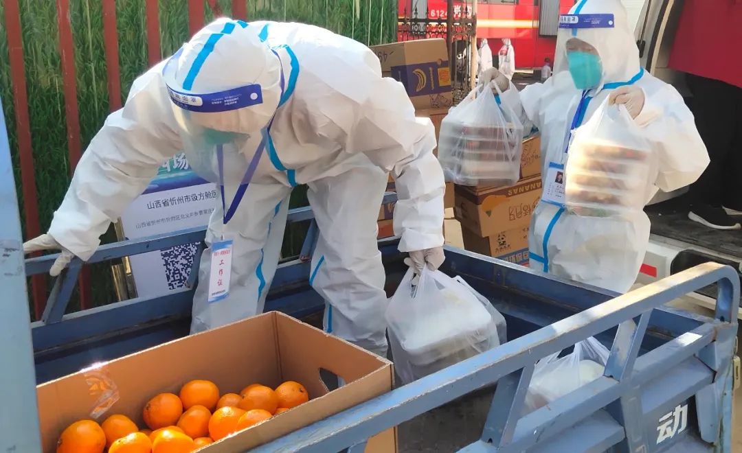 市級(jí)方艙醫(yī)院?jiǎn)⒂靡詠?lái),作為抗疫主力軍的護(hù)航者,后勤是這場(chǎng)疫情保衛(wèi)戰(zhàn)的關(guān)鍵一環(huán)。為做好方艙醫(yī)院運(yùn)行后的餐飲、生活用品及工作人員的住宿等后勤保障服務(wù)工作,忻州市級(jí)方艙醫(yī)院后勤保障工作組夜以繼日,辛苦奉獻(xiàn),始終和醫(yī)療團(tuán)隊(duì)從黑夜到黎明奮戰(zhàn)在一線。18日中午12點(diǎn),記者來(lái)到忻州市方艙醫(yī)院大門口看到,方艙內(nèi)外保障組工作人員正在交接餐食,一包包盒飯、水果從餐車拿出來(lái)放到三輪車上,然后由艙內(nèi)后勤保障組工作人員送到方艙內(nèi)醫(yī)護(hù)人員的手中。