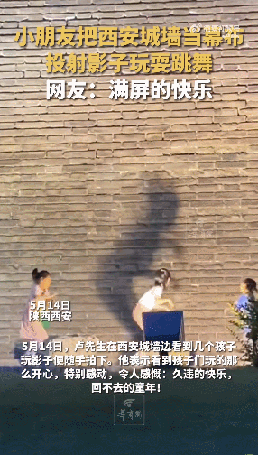 圖片來源:武漢廣播電視臺(tái)視頻截圖 西安城墻邊 3個(gè)小朋友用燈把影子投射在城墻 手舞足蹈 玩得不亦樂乎