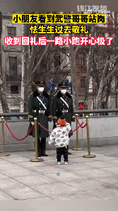 圖片來源:人民網(wǎng)微博視頻截圖 馬路邊 一名小朋友看到武警哥哥在站崗 小心翼翼走上前,跺跺腳敬了個(gè)禮 武警立刻“回禮” 小朋友一路小跑,開心極了