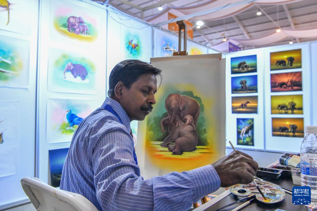 7月26日,斯里蘭卡參展商在南亞館現(xiàn)場作畫。