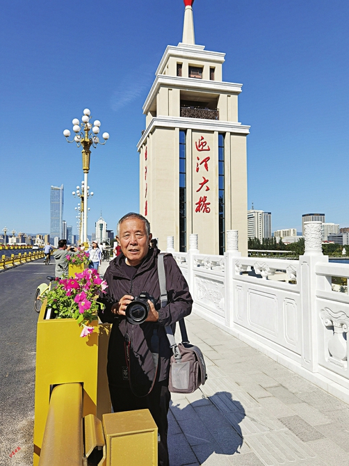75歲的尚慶華與迎澤大橋橋頭堡合影。