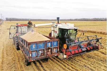目前,中國產(chǎn)糧第一大省黑龍江進(jìn)入秋收時間,開始大面積收獲糧食作物。位于雙鴨山市的黑龍江北大荒農(nóng)業(yè)股份有限公司友誼分公司搶抓晴好天氣,合理調(diào)配機具力量,掀起秋收高潮,確保糧食應(yīng)收盡收、顆粒歸倉。 新華社記者 王松攝