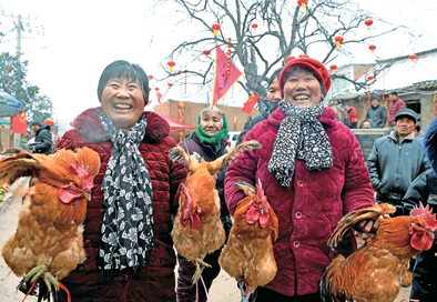 ▲村民展示自家養(yǎng)的土雞。1月16日,河南郟縣前莊村葫蘆套老街舉辦特色年貨大集,以及“話脫貧、感黨恩、謀發(fā)展”鄉(xiāng)村春晚活動(dòng)。新華社發(fā)(郝源攝)