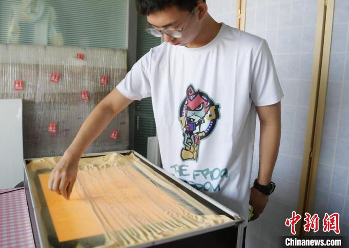 “比方說(看)油畫、國畫之類的,然后我們進(jìn)行二次創(chuàng)作,繪制出小稿,最后去繪制沙畫?!彪拷榻B,自6月中旬著手設(shè)計以來,自己每天都要在一個悶熱的“小黑屋”里待上幾個小時,創(chuàng)作過程總計花費(fèi)近80個小時。