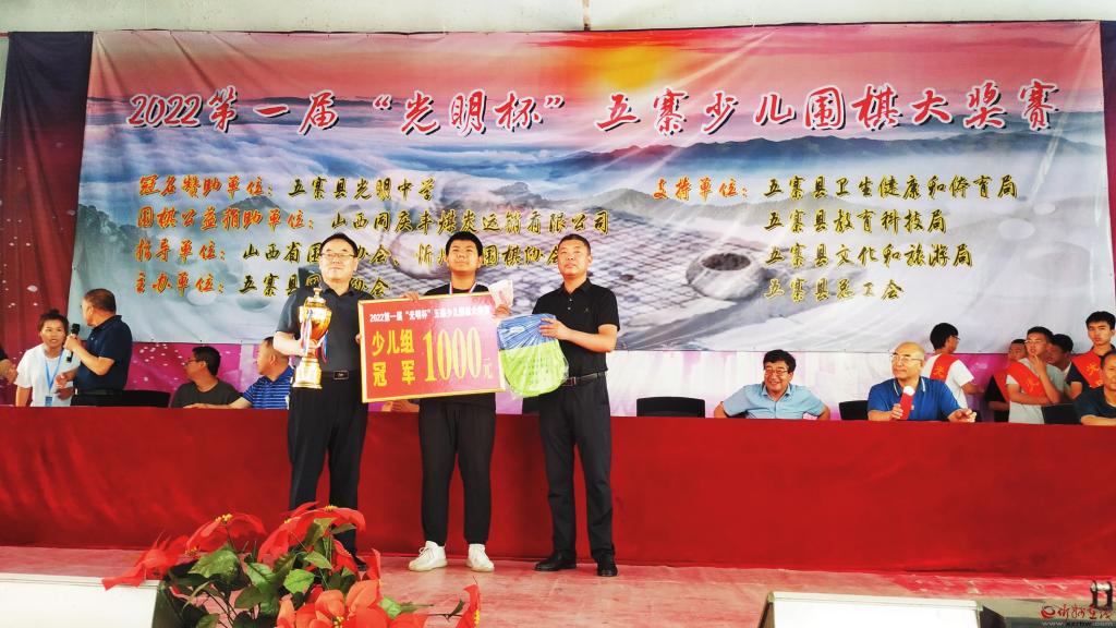 這次大獎(jiǎng)賽由五寨縣圍棋協(xié)會(huì)主辦,五寨縣光明中學(xué)冠名贊助,山西同慶豐煤炭運(yùn)銷有限公司贊助支持。開幕式上,山西省圍棋協(xié)會(huì)向五寨縣圍棋協(xié)會(huì)捐贈(zèng)了價(jià)值8500元的智能一體機(jī)一臺(tái),忻州市圍棋協(xié)會(huì)向五寨縣圍棋協(xié)會(huì)頒發(fā)了“立足五寨沃土,培養(yǎng)圍棋人才”的獎(jiǎng)牌,并捐贈(zèng)了價(jià)值7200元的高檔圍棋凳40個(gè)。山西省圍棋協(xié)會(huì)向五寨縣光明中學(xué)捐贈(zèng)國(guó)學(xué)經(jīng)典書籍一套,山西人民出版社社長(zhǎng)姚軍(圍棋5段)向大賽組委會(huì)贈(zèng)送書法作品一幅。
