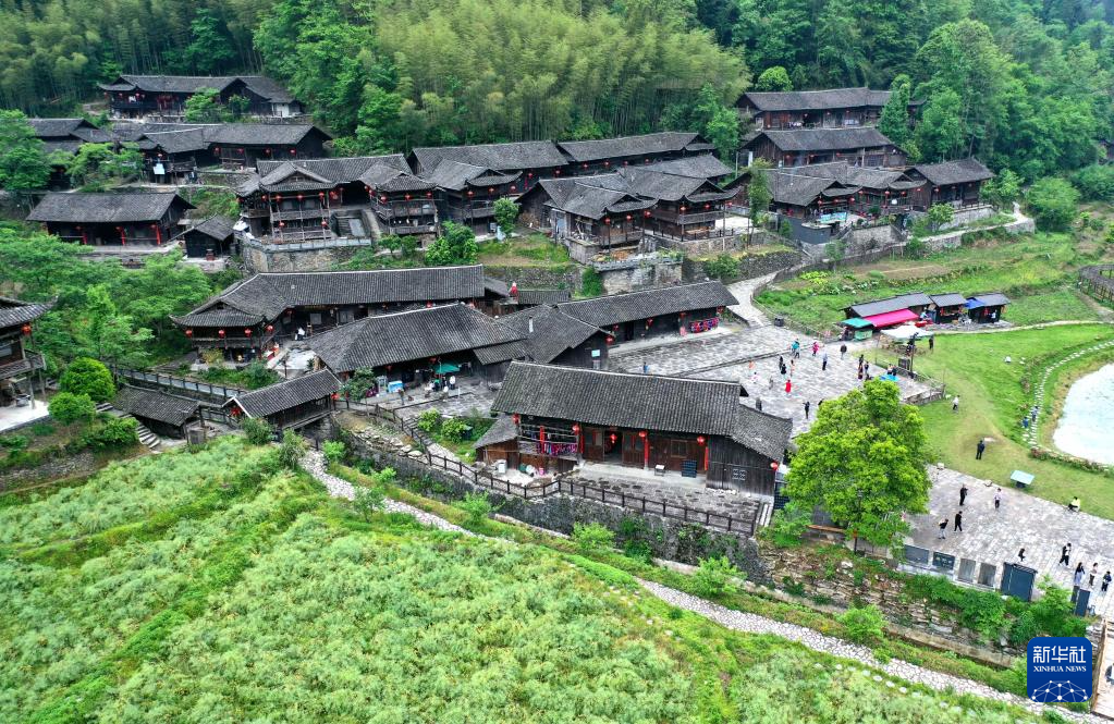 位于湖北省宣恩縣沙道溝鎮(zhèn)的彭家寨古吊腳樓群歷史悠久,吊腳樓保存完好,古樸雅致,是當(dāng)?shù)孛袼孜幕糜蔚臒衢T(mén)打卡地(5月2日攝,無(wú)人機(jī)照片)。