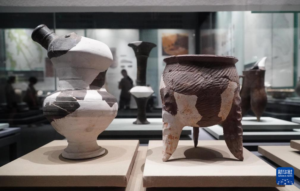 成果展上展出的二里頭夏都遺址博物館藏二里頭文化陶器(7月12日攝)。