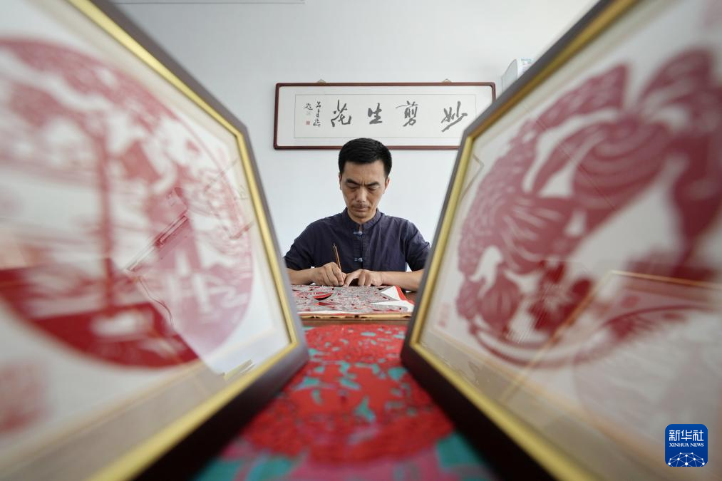 9月16日,剪紙藝人在玉田縣“非遺會(huì)客廳”工作室內(nèi)創(chuàng)作剪紙作品。