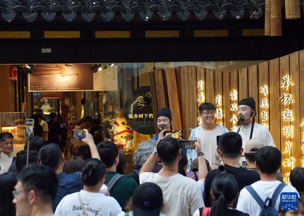 9月17日,在豫園商城,扮演李白、杜甫的演員邀請(qǐng)游客進(jìn)行對(duì)詩(shī)和猜謎等互動(dòng)游戲。