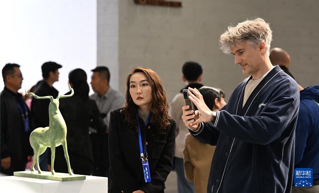 10月14日,觀眾在首屆呼和浩特國(guó)際雕塑藝術(shù)展上觀賞雕塑作品。