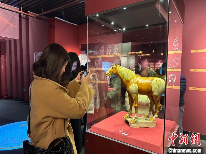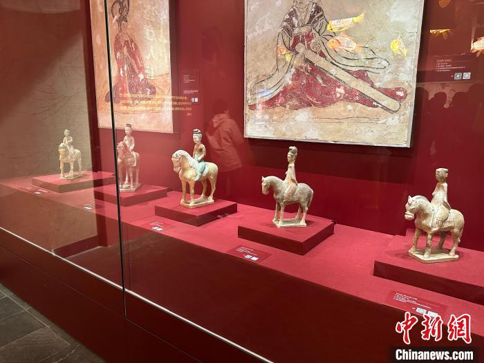26日,“絕代風(fēng)華——唐代女性生活展”在福州開展,吸引了許多觀眾。中新網(wǎng)記者 鄭江洛 攝 展陳設(shè)計(jì)運(yùn)用了唐朝紋飾、唐墓壁畫以及唐代經(jīng)典畫作中的藝術(shù)形象作為設(shè)計(jì)元素,充分闡釋了唐文化的特質(zhì)。展廳各單元中穿插設(shè)置了唐代的生活化元素如燈盞、屏風(fēng)、帷幔等,引導(dǎo)觀眾現(xiàn)場(chǎng)感受“唐風(fēng)唐韻”的時(shí)代風(fēng)貌。 唐墓中的壁畫和彩色陶俑是唐代極具代表性的藝術(shù)珍品。記者在展廳看到,女性陶俑類型多樣,各種女坐俑、立俑、侍俑、樂舞俑、騎馬俑、貴婦俑……這些女俑造型生動(dòng),尤其是三彩女俑,釉色艷麗,呈現(xiàn)了唐代女性“千人千面”的生存狀態(tài)。