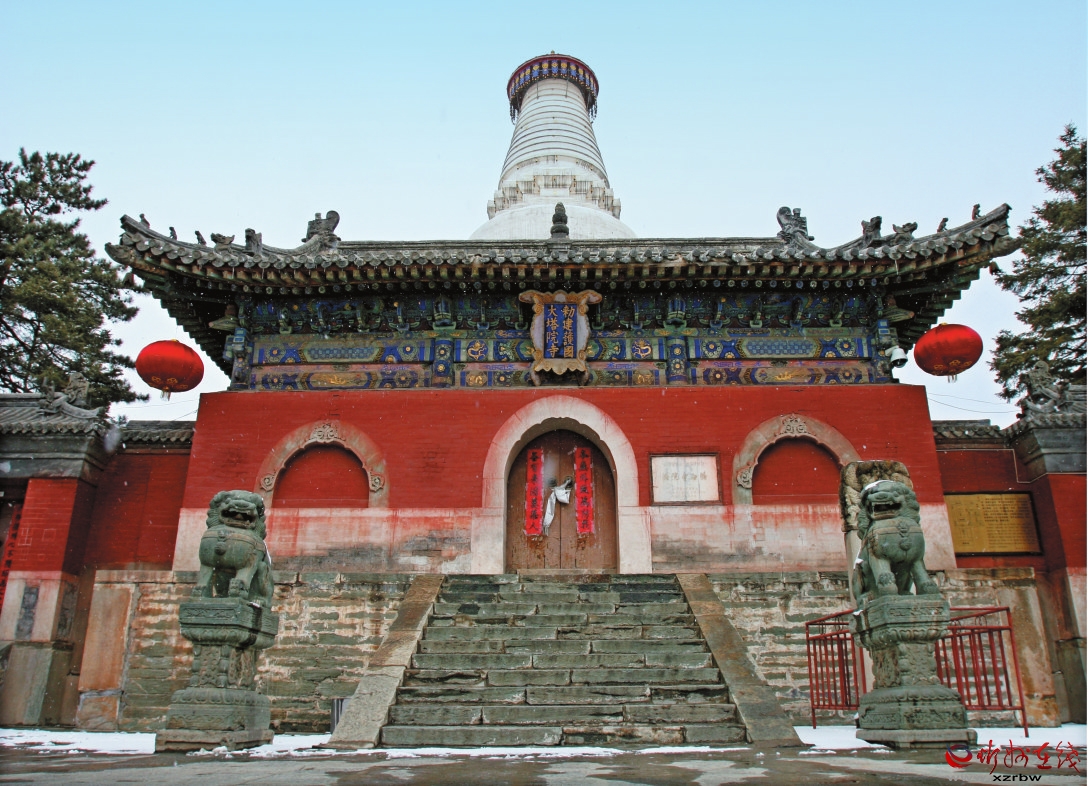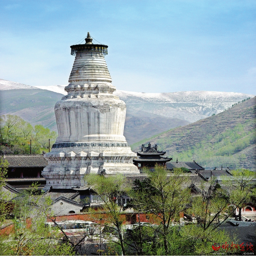 大白塔全名釋迦文佛真身舍利寶塔。該塔在元大德五年(公元1302年)由尼泊爾匠師阿尼歌設(shè)計(jì)建造,塔身用石頭砌成。地上部分高度為56.37米,比北京北海大白塔高20.4米,故有“清涼第一圣境”的美譽(yù)。大白塔之東,一進(jìn)三院。前院為都綱院,中院為錢(qián)糧庫(kù),后院為方丈院。
