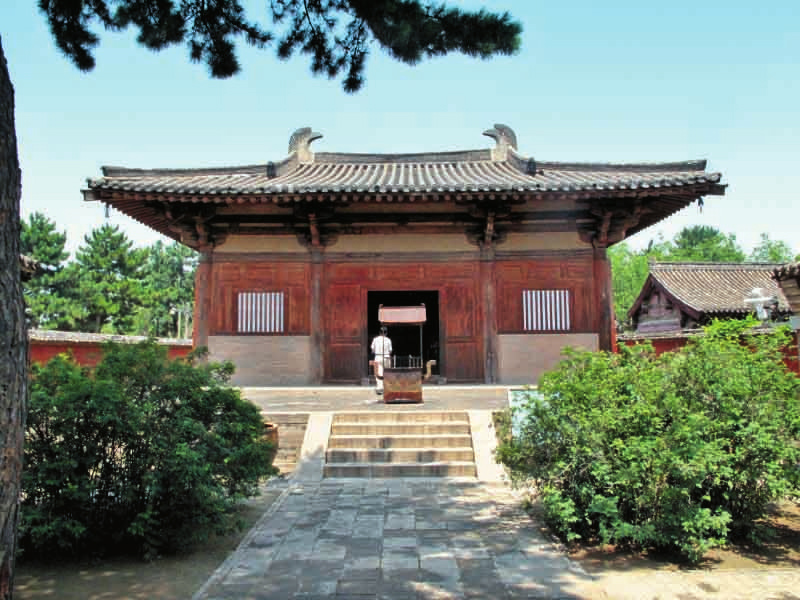 南禪寺大殿面闊、進(jìn)深各3間,平面近方形,單檐歇山灰色筒板瓦頂。大殿屋頂舉折極為平緩,在我國(guó)現(xiàn)存宋、金以前的建筑中,是最為平緩的一座。