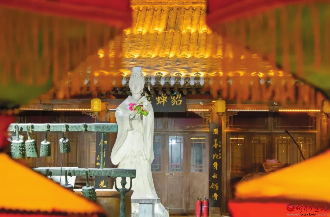 現(xiàn)在的貂蟬陵園是在墓地原址重新筑砌的,坐北朝南,門檐上懸“貂蟬陵園”橫匾,兩側(cè)有“閉月羞花堪為中國驕傲,忍辱步險實(shí)令須眉仰止”的金文楹聯(lián)。園內(nèi)用花墻分隔成南、北兩部分,北為陵區(qū),南為展區(qū)。南院建貂蟬彩塑館,再現(xiàn)“貂蟬迎賓”“羞花問世”“祭山驚艷”“落難認(rèn)父”“拜月銘志”“憂國請纓”“施計除奸”“繡袍寄情”等場面,反映了貂蟬“不惜萬金軀,何懼險象生”的一生。