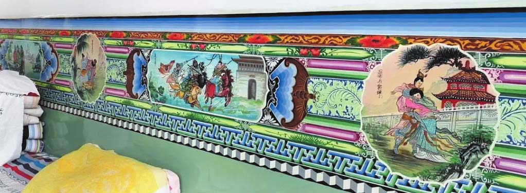 炕圍畫也叫墻圍畫,距今已有1200多年歷史,是原平人特有的“根脈性”藝術(shù)。手工藝人以墻為紙,將民族文化與當?shù)厣睢⒕袂擅钊诤?,造型藝術(shù)集壁畫、年畫和建筑彩繪于一體,定格于墻壁之上,代代相傳?!?7歲起,我就跟隨父親學習炕圍畫技藝,如今有60多年了?!惫M壽感慨道,“以前家家戶戶都會在炕邊畫炕圍畫。隨著時代變遷,人們住進了樓房,我們就把炕圍畫畫在紙上。”