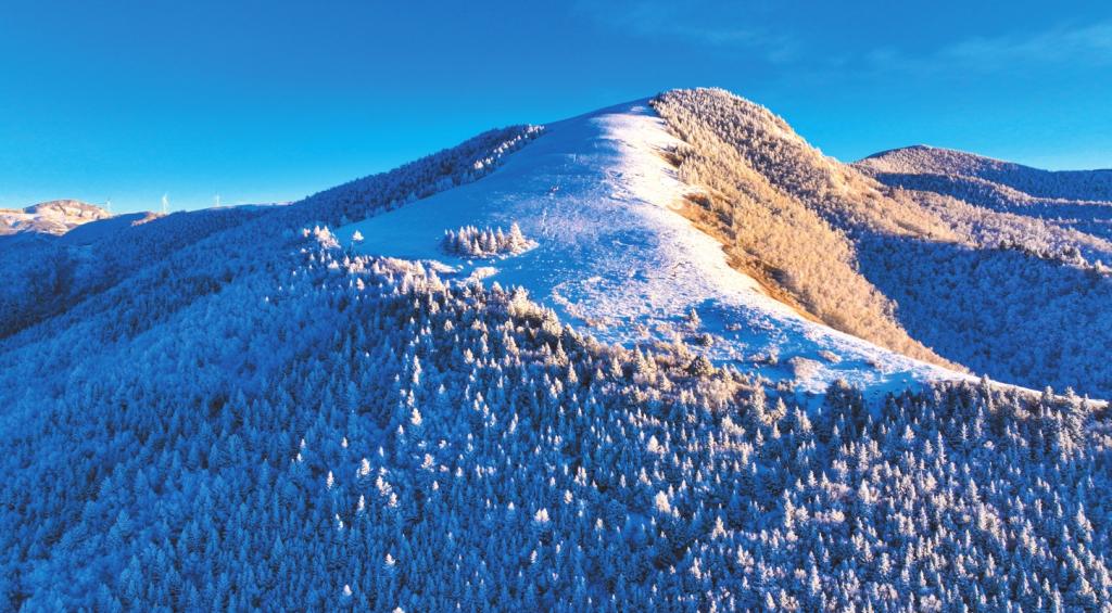 冬之凈,返璞歸真的意蘊(yùn)。當(dāng)一場(chǎng)大雪如期而至,金山梁便徹底沉靜下來,進(jìn)入一個(gè)冰雕玉砌的童話世界。梁頂之上,積雪平整如鏡,宛如瓊瑤鋪地,反射著清冷而純粹的日光。而當(dāng)陽光突破云層,照射在冰面上,則光芒閃耀,令人不敢直視。松枝上堆滿了蓬松的積雪,傲立于山崖,盡顯在嚴(yán)酷中堅(jiān)守的堅(jiān)韌品格;山間那些奇形怪狀的巖石,覆上白霜后,更是空蒙清靈,意韻悠長(zhǎng)。生命的痕跡并未完全消失,偶有野兔為了覓食奔躍而過,在雪地上留下一串輕盈的足跡,但轉(zhuǎn)瞬便被新雪覆蓋,似乎了無痕跡;時(shí)有耐寒的鳥兒掠崖飛去,翅羽間振落的冰晶,在空中劃出一道優(yōu)美的弧線。