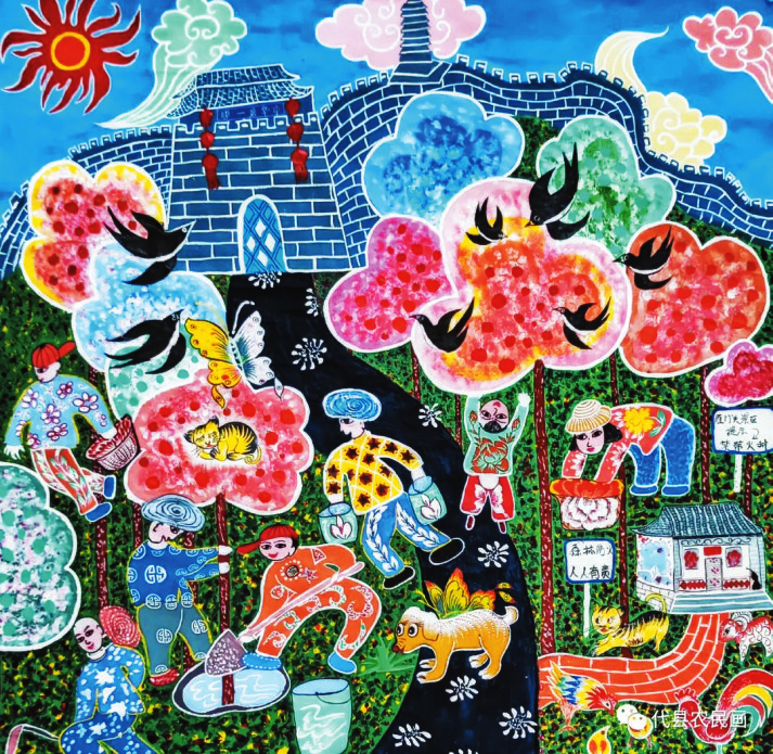 中國歷史文化名城代縣,文化底蘊深厚,民俗傳統(tǒng)技藝精巧別致,1988年和2008年先后被文化部授予“中國民間繪畫畫鄉(xiāng)”“中國民間文化藝術(shù)之鄉(xiāng)”。該縣的農(nóng)民畫早在上世紀80年代初就在全國產(chǎn)生過較大影響,之后經(jīng)歷了一段低迷期。近年來在代縣農(nóng)民畫促進會的推動之下,農(nóng)民畫又重新煥發(fā)出耀眼的光彩。先后涌現(xiàn)出多位畫家,其中尤以丁全愛、戴翠平、祁磊、賈永花、郎冬梅等18位女畫家組陣的雁門巾幗,在多年鉆研繪畫技巧的基礎(chǔ)上,創(chuàng)作出一幅幅特色鮮明、獨具匠心的畫作,成為閃耀三晉大地的矩陣,為傳承、弘揚雁門文化做出了新貢獻。