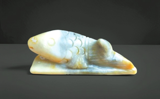 筆者藏有一件“魚躍竹排”白玉筆架,長(zhǎng)10厘米,寬2.5厘米,高3.6厘米。筆架雕一碩大魚兒躍于竹排之上,以雙鰭為支撐,魚尾舒展,一側(cè)貼于排面,另一側(cè)微微傾斜向上、向左卷曲,恰好承筆;魚頭昂揚(yáng),宛如一幅魚乘竹排、暢游河中的立體畫卷。