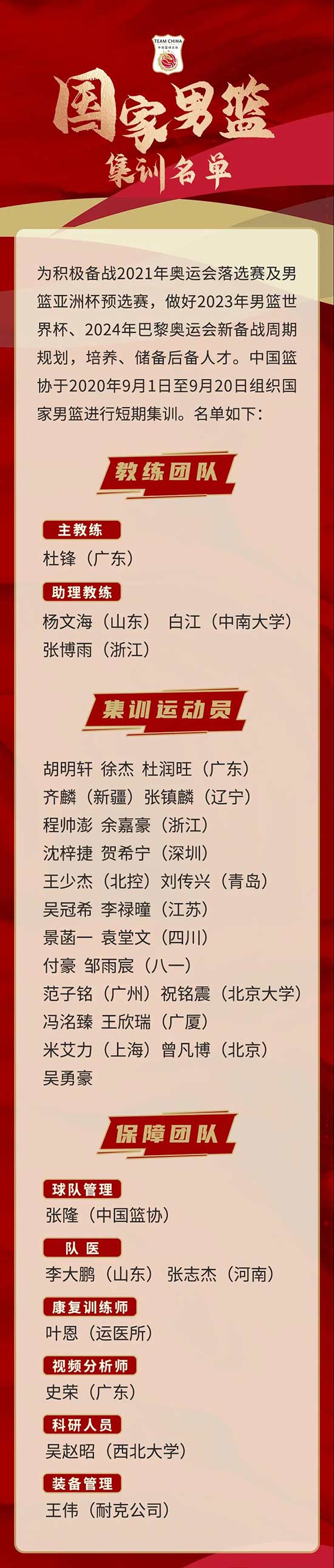 人民網(wǎng)北京8月26日電(郝帥)為積極備戰(zhàn)2021年奧運(yùn)會落選賽及男籃亞洲杯預(yù)選賽,做好2023年男籃世界杯、2024年巴黎奧運(yùn)會新備戰(zhàn)周期規(guī)劃,培養(yǎng)、儲備后備人才。中國籃協(xié)于2020年9月1日至9月20日組織國家男籃進(jìn)行短期集訓(xùn),名單今日出爐。
