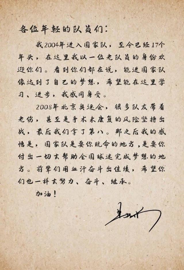 易建聯(lián)在信中回顧了自己首次入選國家隊(duì)的感受,表示自己完全能理解新隊(duì)員此刻的心情,他尤其強(qiáng)調(diào)了榮譽(yù)感與責(zé)任感,對這些小兄弟們說“國家隊(duì)是要你玩命的地方”,“各位年輕隊(duì)員們,我2004年進(jìn)入國家隊(duì),至今已經(jīng)有17個(gè)年頭,在這里我以一位老隊(duì)員的身份歡迎你們??吹侥銈兌荚谡f,能進(jìn)國家隊(duì)像達(dá)到了自己的夢想,希望能在這里學(xué)習(xí)、進(jìn)步,我感同身受。2008年北京奧運(yùn)會,很多隊(duì)友帶著老傷,甚至是手術(shù)未康復(fù)的風(fēng)險(xiǎn)堅(jiān)持出戰(zhàn),最后我們拿到了第八。那之后我的感悟是,國家隊(duì)是要你玩命的地方,是要你付出一切去幫助全國球迷完成夢想的地方。前輩們用血汗奮斗出佳績,希望你們也一樣去努力、奮斗、繼承。”