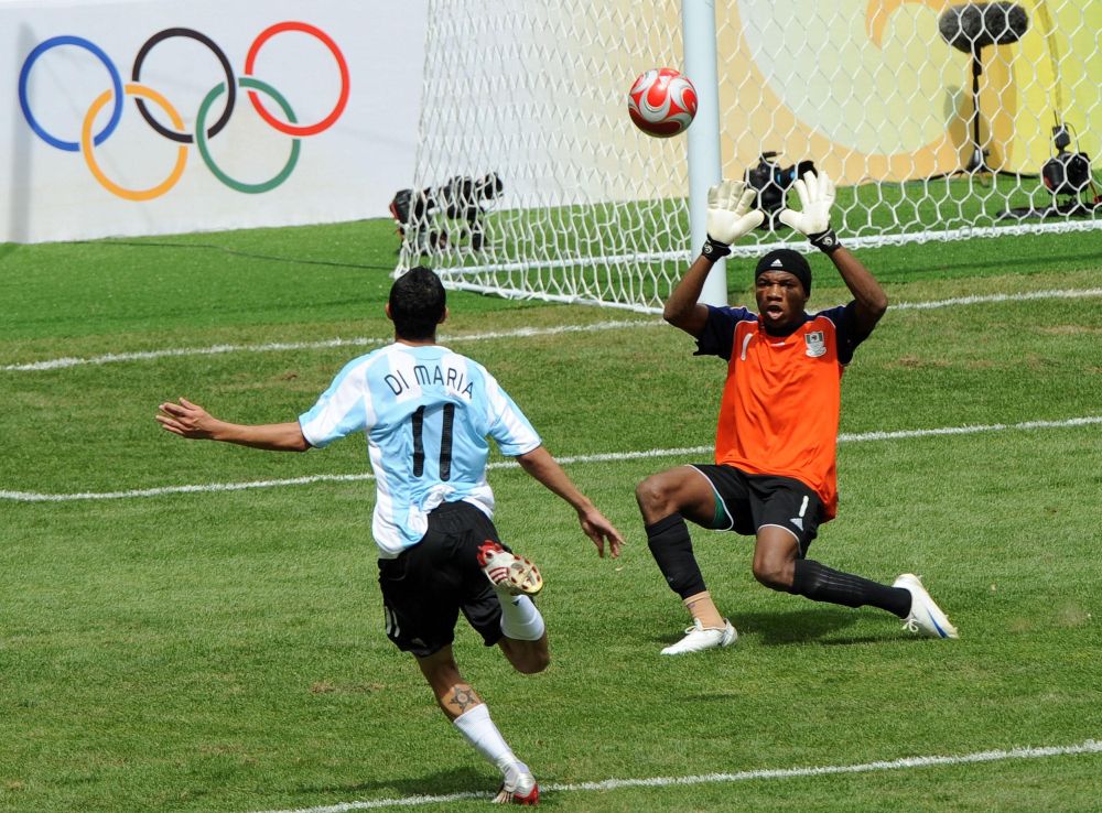 2008年8月23日,阿根廷隊球員迪馬利亞(左)破門得分。當(dāng)日,北京奧運(yùn)會男子足球決賽在國家體育場——“鳥巢”舉行,阿根廷隊迎戰(zhàn)尼日利亞隊。新華社記者 李鋼 攝