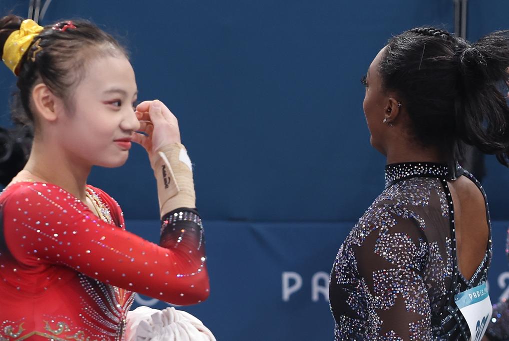 7月28日,美國選手拜爾斯(右)與中國選手邱祺緣在轉換項目。當日,巴黎奧運會體操女子資格賽在貝爾西體育館舉行。 新華社記者 曹燦 攝