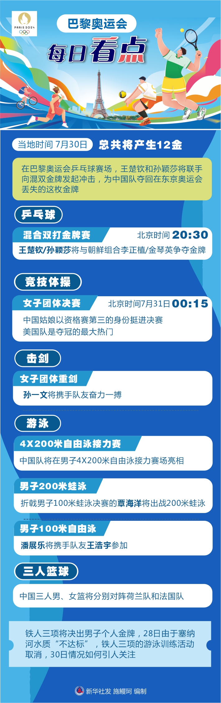 還有一些項目將拉開戰(zhàn)幕。中國三人男、女籃將分別對陣荷蘭隊和法國隊。鐵人三項將決出男子個人金牌,28日由于塞納河水質(zhì)“不達標”,鐵人三項的游泳訓練活動取消,30日情況如何引人關注。