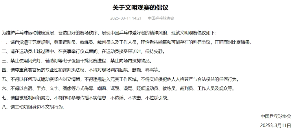 中國(guó)乒協(xié)表示,為維護(hù)乒乓球運(yùn)動(dòng)健康發(fā)展,營(yíng)造良好的賽場(chǎng)秩序,展現(xiàn)中國(guó)乒乓球愛(ài)好者的精神風(fēng)貌,特提出文明觀賽的倡議。