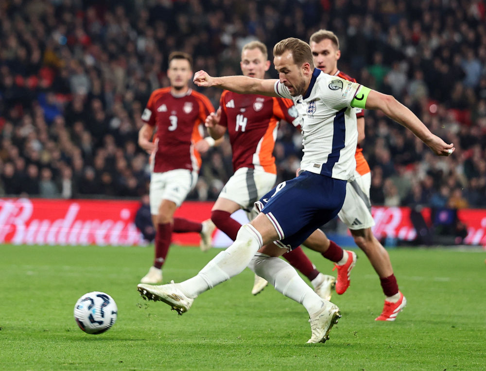 3月24日,英格蘭隊球員凱恩(前)在比賽中射門得分。新華社/路透