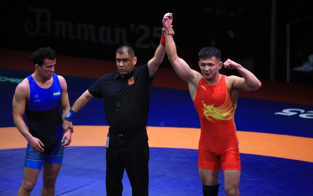 中國隊(duì)選手鄒萬豪在當(dāng)日舉行的男子自由式摔跤61公斤級(jí)銅牌賽中,以4:2戰(zhàn)勝吉爾吉斯斯坦選手梅爾扎納扎爾·吾魯。來自新疆的阿黑由·吐爾遜在74公斤級(jí)銅牌賽中,以4:0戰(zhàn)勝烏茲別克斯坦選手納斯?fàn)柼峒局Z夫,為中國隊(duì)再添一枚銅牌。