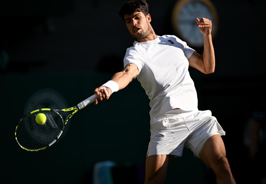 7月8日,阿爾卡拉斯在比賽中回球。新華社記者 李穎 攝