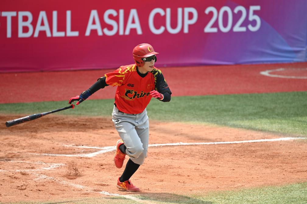 7月16日,中國(guó)隊(duì)球員任敏在擊球后跑壘。新華社記者 鄒競(jìng)一 攝