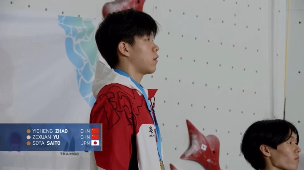 趙一程在頒獎(jiǎng)儀式上 U19組女子速度賽中,中國(guó)隊(duì)包攬前三,蒙世雪、王宇婷、白玉美分獲冠亞季軍。 獎(jiǎng)牌榜方面,日本隊(duì)?wèi){借在攀石和難度項(xiàng)目中取得的5枚金牌名列榜首。 (責(zé)任編輯:蔡文斌) |