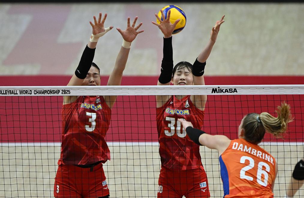日本隊球員在比賽中攔網(wǎng)。新華社記者 侯昭康 攝