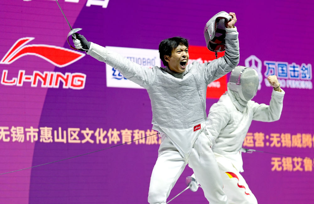 沈晨鵬(左)在男子佩劍團(tuán)體賽決賽中慶祝得分
