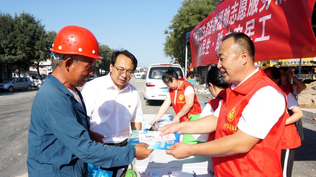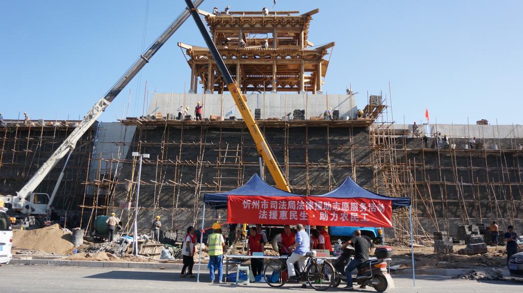 為深入貫徹落實(shí)習(xí)近平新時(shí)代中國(guó)特色社會(huì)主義思想和黨的十九大及十九屆二中、三中、四中全會(huì)精神,貫徹落實(shí)《保障農(nóng)民工工資支付條例》和國(guó)家、山西省關(guān)于農(nóng)民工服務(wù)工作的部署,切實(shí)加強(qiáng)我市農(nóng)民工安全生產(chǎn)意識(shí),提高農(nóng)民工的維權(quán)意識(shí)和維權(quán)能力,8月13日下午,忻州市司法局組織市法律援助中心、公證處、律師事務(wù)所、司法鑒定中心組成法律援助志愿服務(wù)隊(duì),走進(jìn)忻州古城建筑工地現(xiàn)場(chǎng),開(kāi)展了“法援惠民生·助力農(nóng)民工”法律援助志愿服務(wù)活動(dòng)。