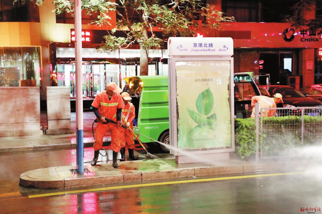 九月九日晚,原平市環(huán)衛(wèi)工人利用晚上路上人少車少的有利時(shí)機(jī),清洗京原北路的道路死角。 本報(bào)通訊員 攝