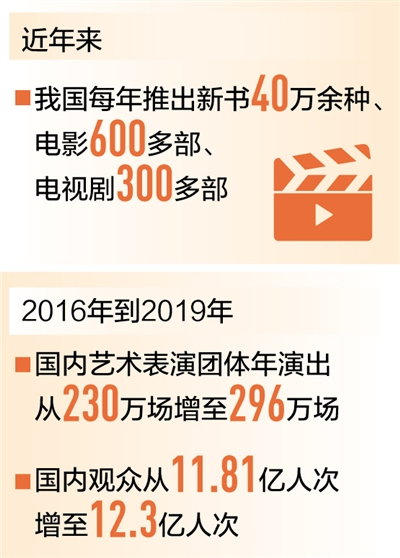 在作品質(zhì)量提升的同時(shí),我國(guó)文化產(chǎn)品的供給能力也在持續(xù)增強(qiáng)。目前我國(guó)每年推出新書40萬(wàn)余種、童書4萬(wàn)多種、電影600多部、電視劇300多部、動(dòng)漫400多部……眾多文化產(chǎn)品的生產(chǎn)規(guī)模位居世界前列。演出市場(chǎng)持續(xù)繁榮,2016年到2019年,國(guó)內(nèi)藝術(shù)表演團(tuán)體年演出場(chǎng)次從230萬(wàn)場(chǎng)增長(zhǎng)至296萬(wàn)場(chǎng),國(guó)內(nèi)觀眾從11.81億人次增加至12.3億人次,其中農(nóng)村觀眾超過(guò)7億人次。