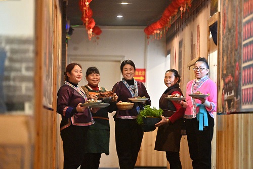 2025年2月28日,在廣西柳州市融水苗族自治縣融水鎮(zhèn)一家餐館,負(fù)責(zé)人吳葵花(中)和員工展示菜品。吳葵花經(jīng)營餐館22年,長期為當(dāng)?shù)剞r(nóng)村群眾提供穩(wěn)定就業(yè)崗位,并收購偏遠(yuǎn)山區(qū)群眾種植的蔬菜。在廣西大山里,一批女能人活躍在農(nóng)村電商、民宿餐飲、鄉(xiāng)村文旅等各個(gè)領(lǐng)域,帶動(dòng)留守婦女發(fā)展產(chǎn)業(yè),實(shí)現(xiàn)就近居家就業(yè)創(chuàng)業(yè)。新華社記者 黃孝邦 攝